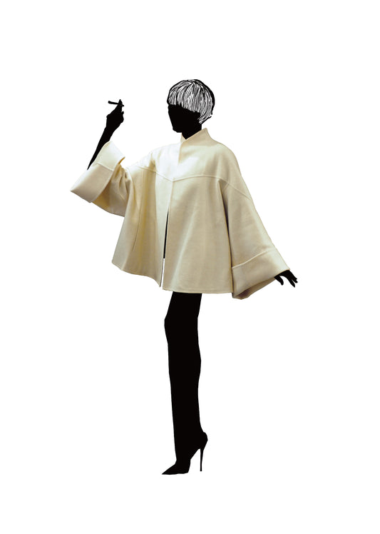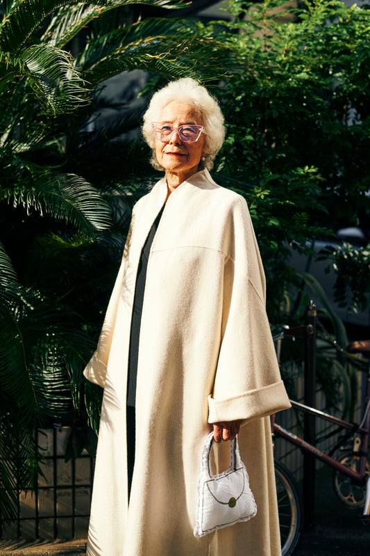ラテン語で「女優」を意味する Mimaが提案する「女優コート」広い袖とゆったりとした蹴回し 計算し尽くされたショルダーラインが特徴 年齢を選ばない それぞれの体型に合うパターンで どんな着こなしにも合わせられる 和洋兼用の万能コートです